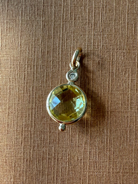 14K Solid Yellow Gold, Diamond, Lemon Quartz Mini Pendant