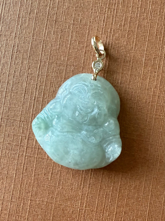 14K Solid Yellow Gold, Diamond, Pale Green Jade “Buddha” Pendant