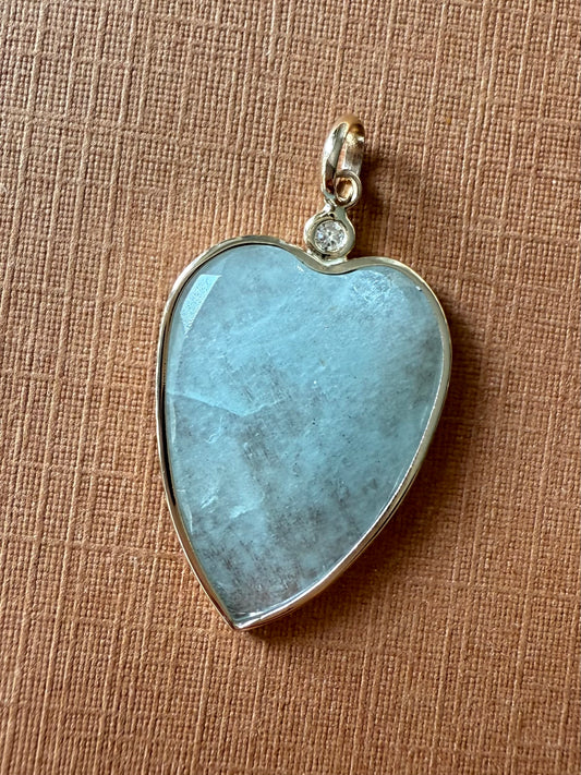 14k Solid Yellow Gold, Diamond, Pale Blue Aquamarine “Heart” Pendant