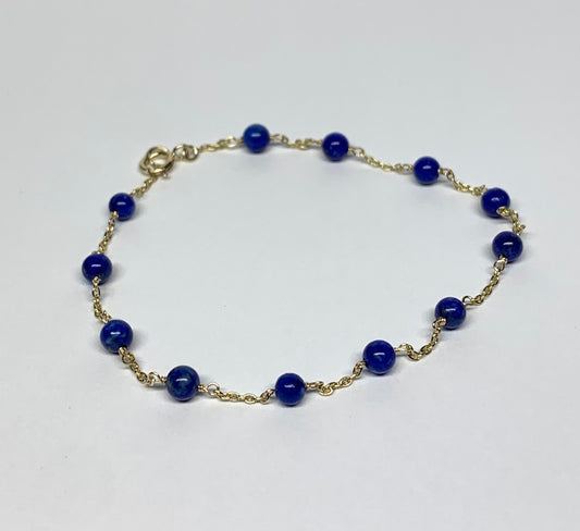 14k Solid Yellow Gold, Blue Lapis Lazuli Beads Station Bracelet