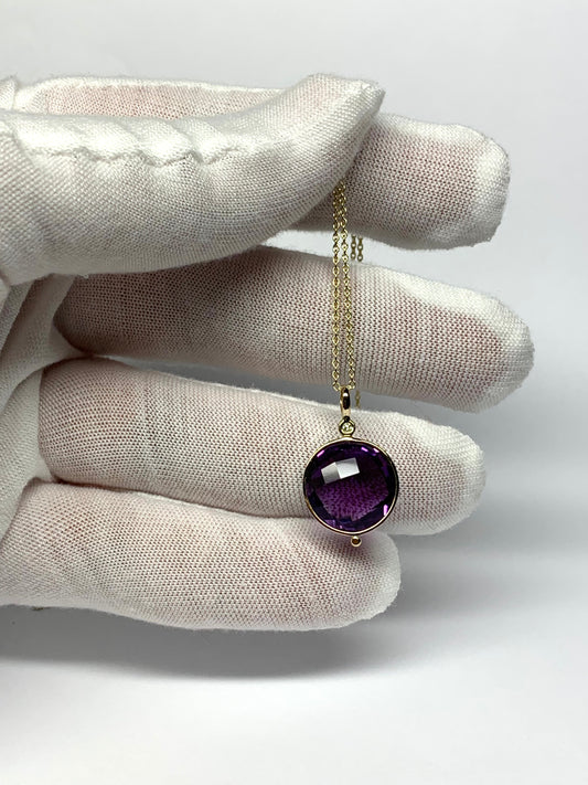 14K Solid Yellow Gold, Diamond, Purple Amethyst Pendant