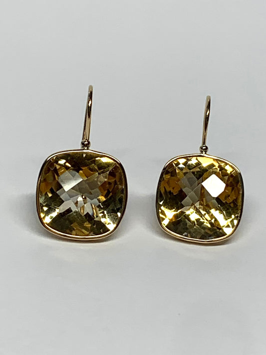 14k Solid Yellow Gold, Citrine Earrings, 12mm Cushion Shaped, Checkerboard Cut, Fish Hook Ear Wire