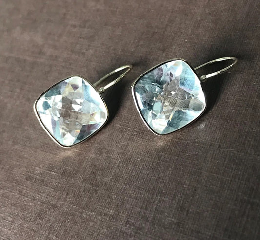 14k Solid Yellow Gold, Clear White Topaz Earrings, Checkerboard Cut, Fish Hook Ear Wire
