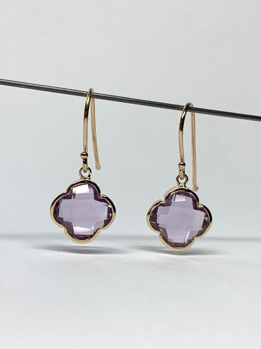 14k Solid Yellow Gold, Pink Amethyst “Clover” Mini Earrings, Fish Hook Ear Wires, French Wire