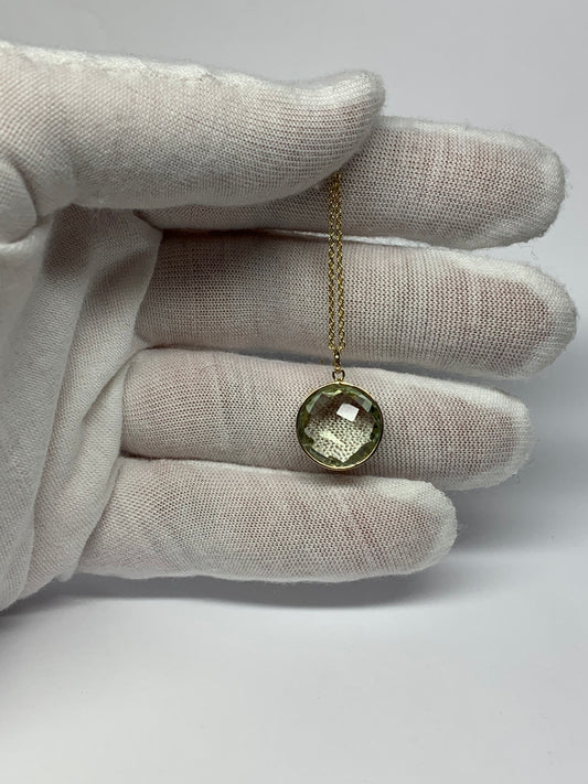 14K Solid Yellow Gold, Round Green Amethyst Drop Pendant, “Crystal Ball”
