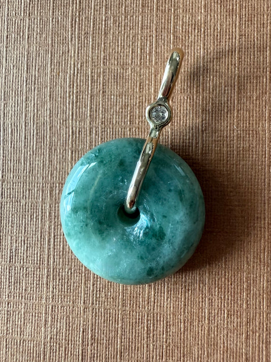 14k Solid Yellow Gold, Very Pale Green Jade “Donut”, White Diamond Pendant