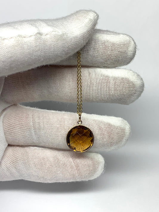 14K Solid Yellow Gold, Round Cognac Quartz Drop Pendant, “Crystal Ball”