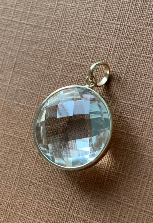 14K Solid Yellow Gold, Round Clear Quartz Drop Pendant, “Crystal Ball”