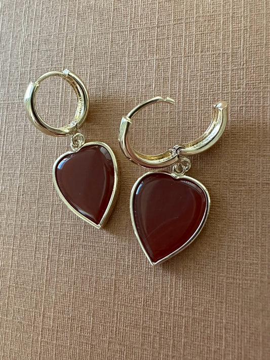 14k Solid Yellow Gold, Red Carnelian Heart Earrings