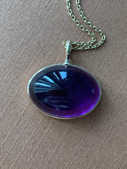 14k Solid Yellow Gold, Purple Amethyst Oval Cabochon Pendant, Small Size