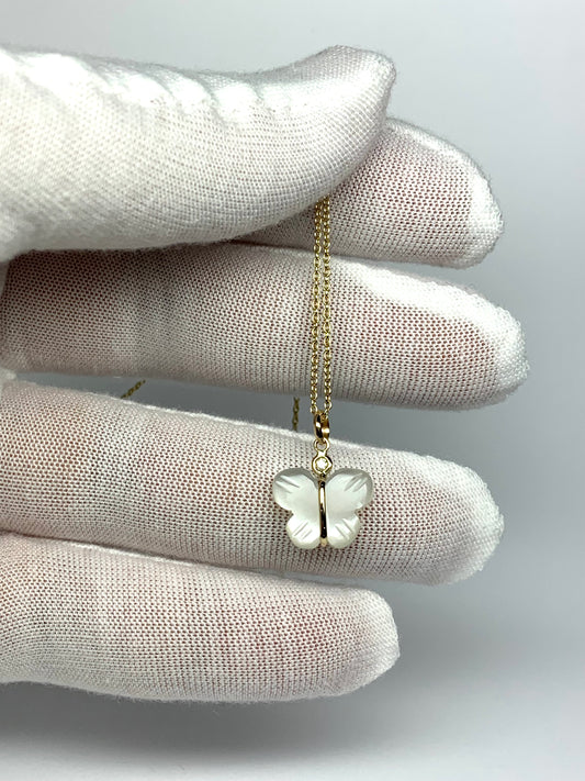 14k Solid Yellow Gold, Diamond, White Moonstone “Butterfly” Mini Pendant, Hand Carved