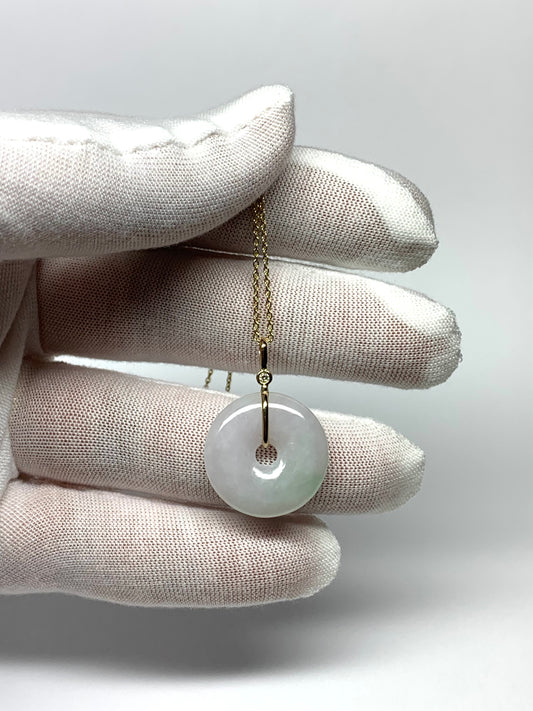 14k Solid Yellow Gold, Very Pale Green Jade “Donut”, White Diamond Pendant