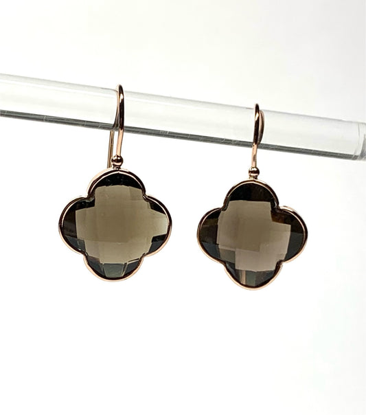14k Solid Rose Gold Smoky Quartz “Clover” Earrings, Checkerboard Cut, Fish Hook Ear Wires
