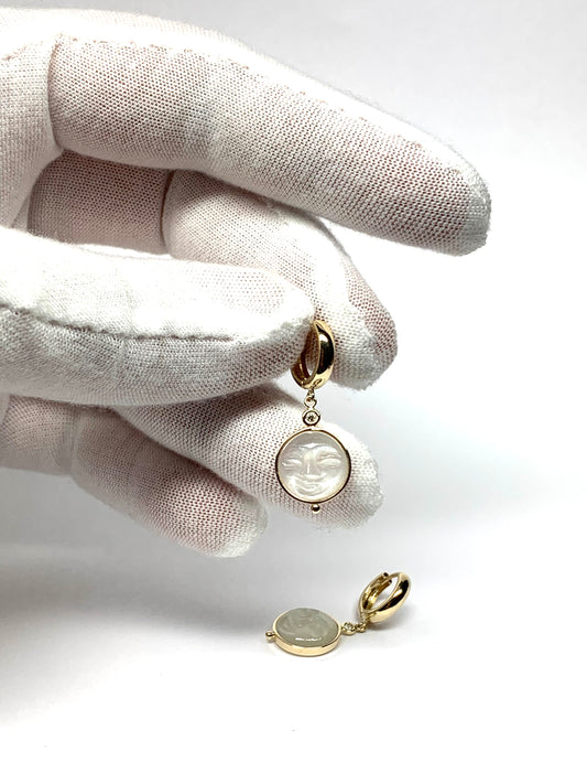 14k Solid Yellow Gold, Diamonds, White Moonstone “Moon and Star” Mini Earrings