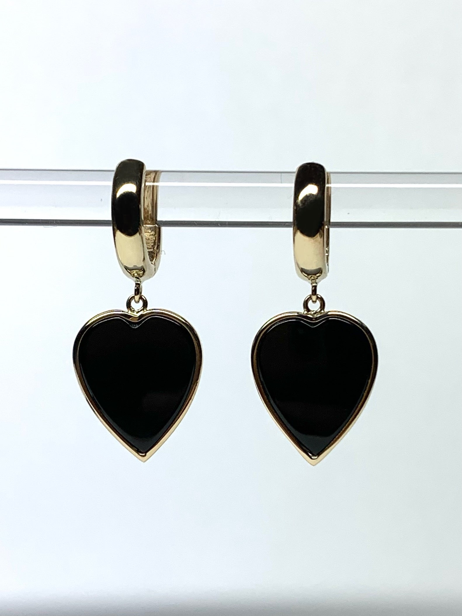 14k Solid Yellow Gold, Black Onyx Heart Earrings