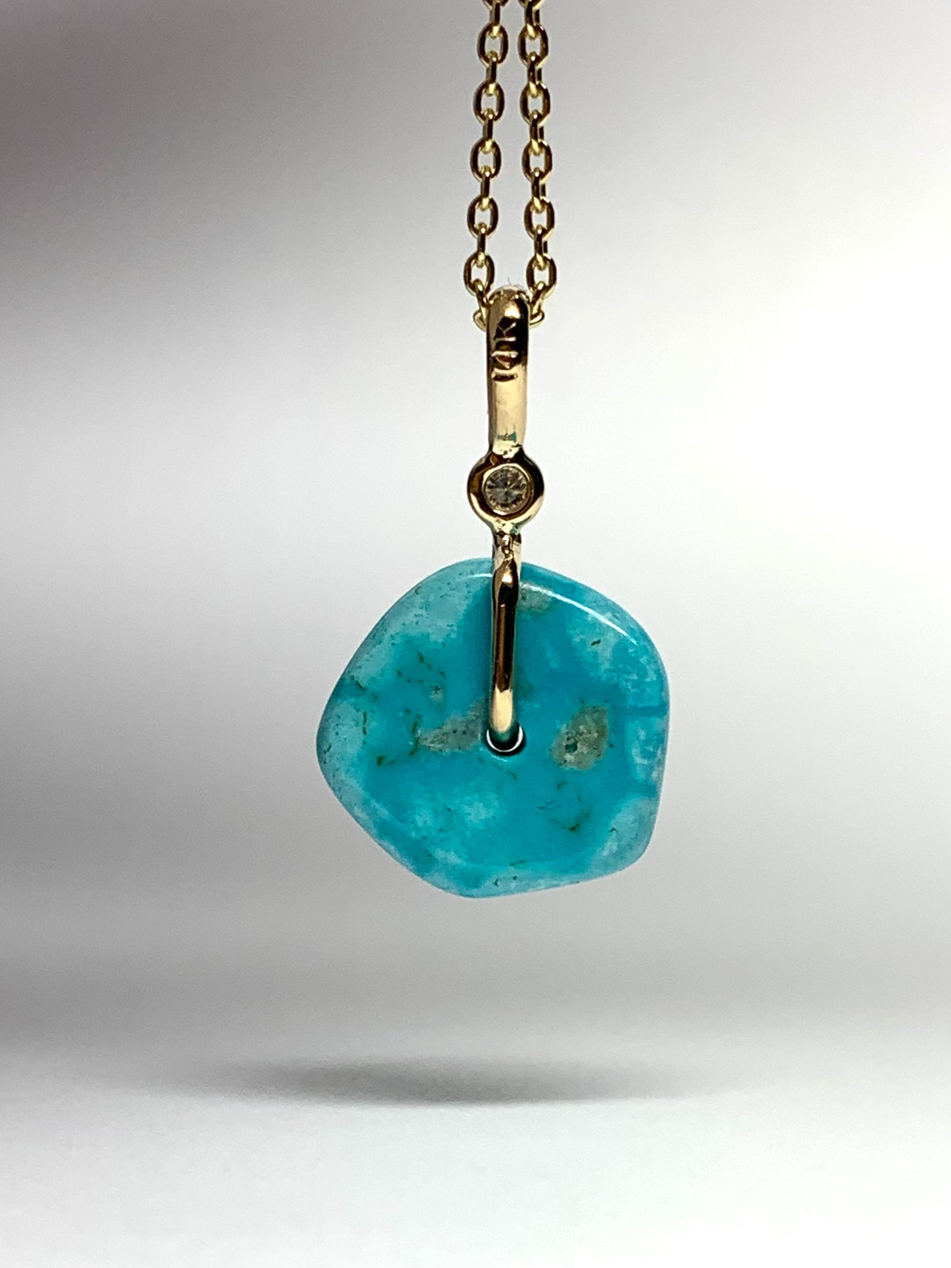 14k solid yellow gold, natural white diamond and blue turquoise “Donut” pendant, small size
