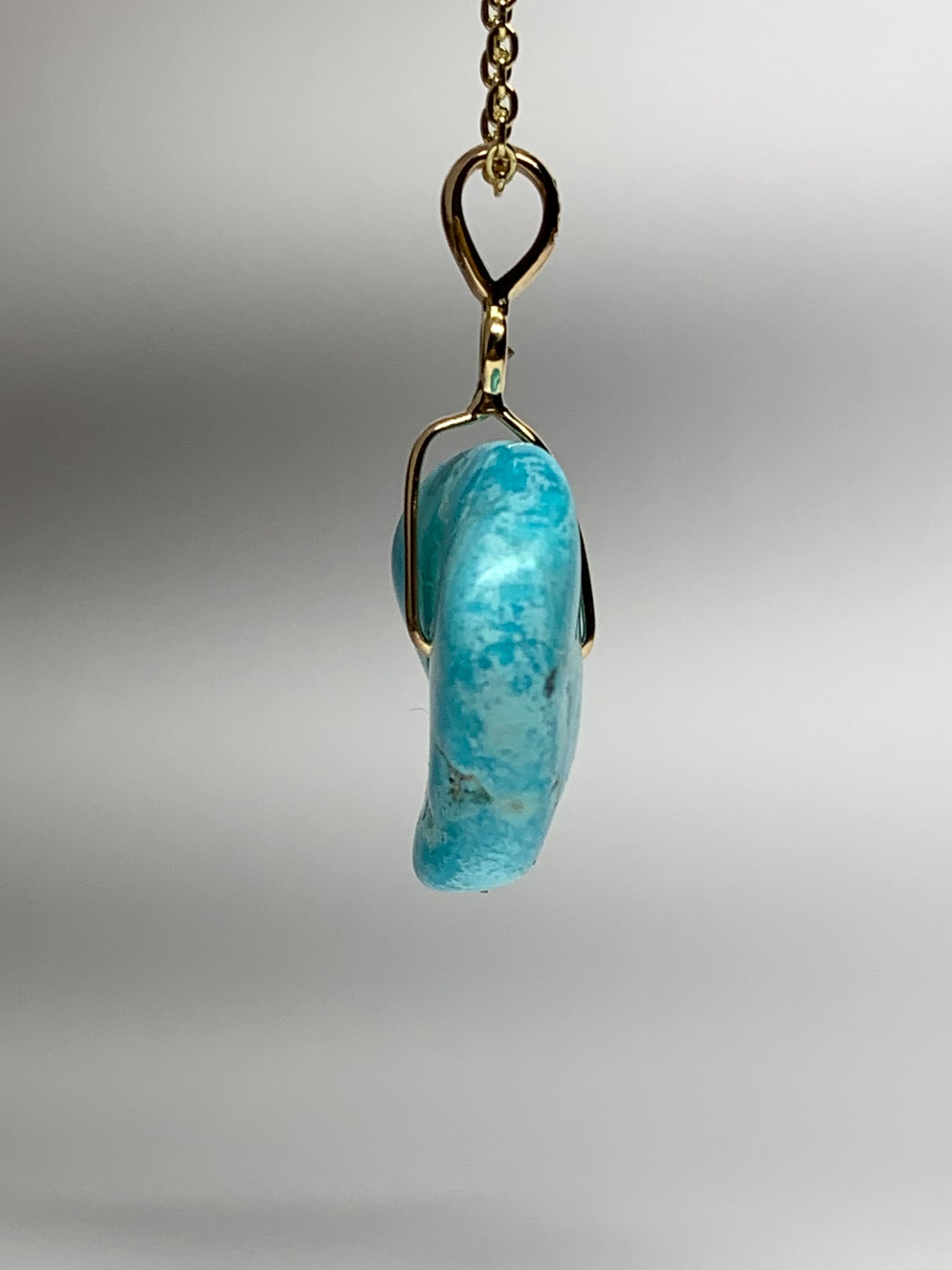 14K Solid Yellow Gold, White Diamond, Blue Turquoise “Donut” Pendant