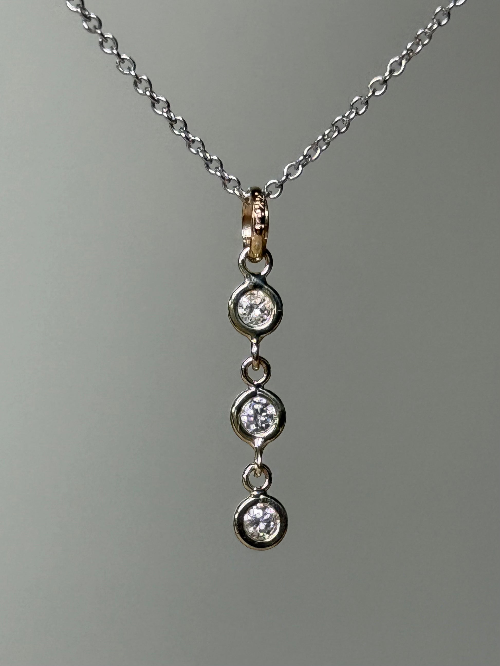 Natural white diamonds are 2.5mm diameter, 0.05 carat each, 0.15 carats total diamonds weight per pendant
