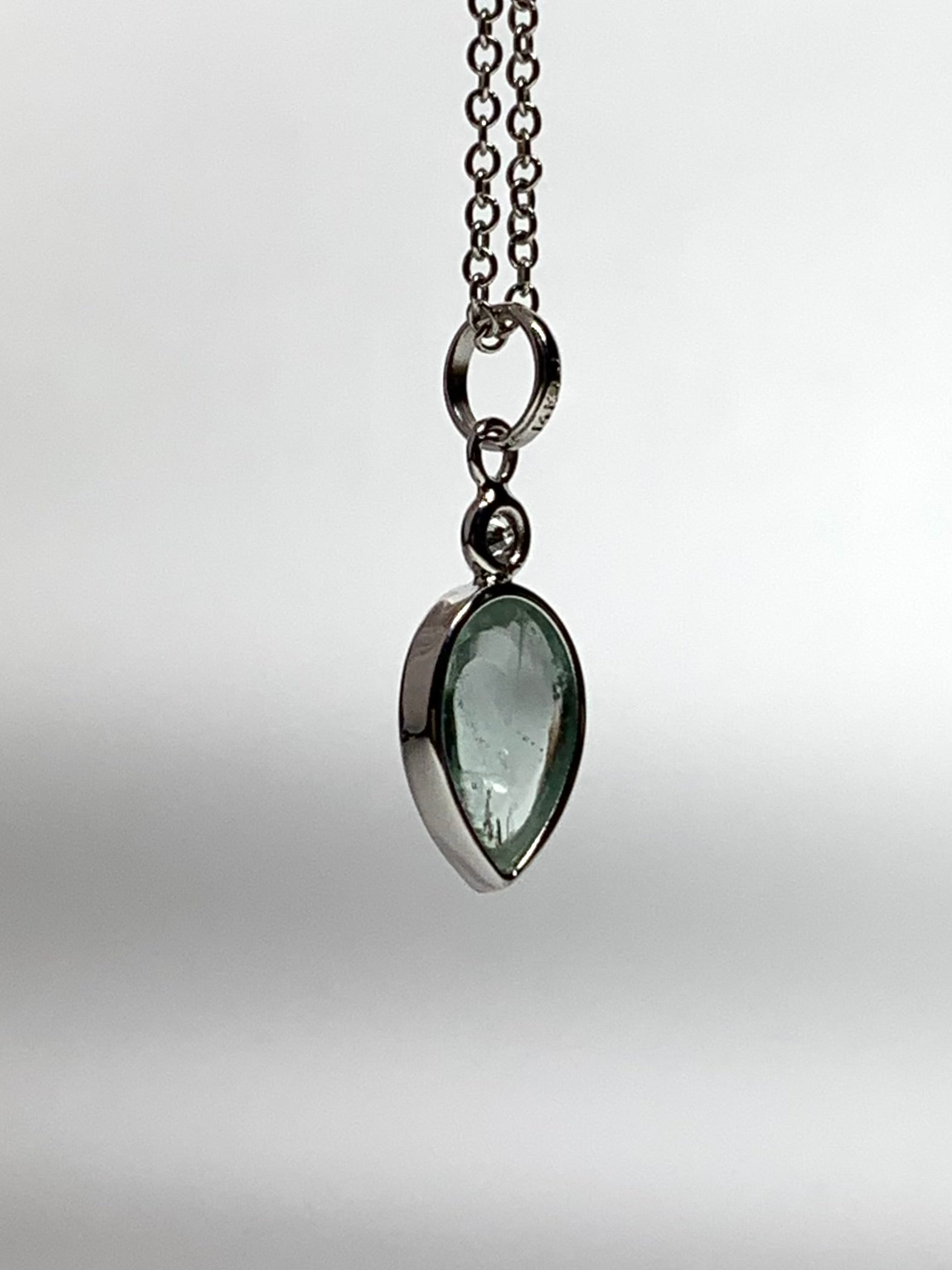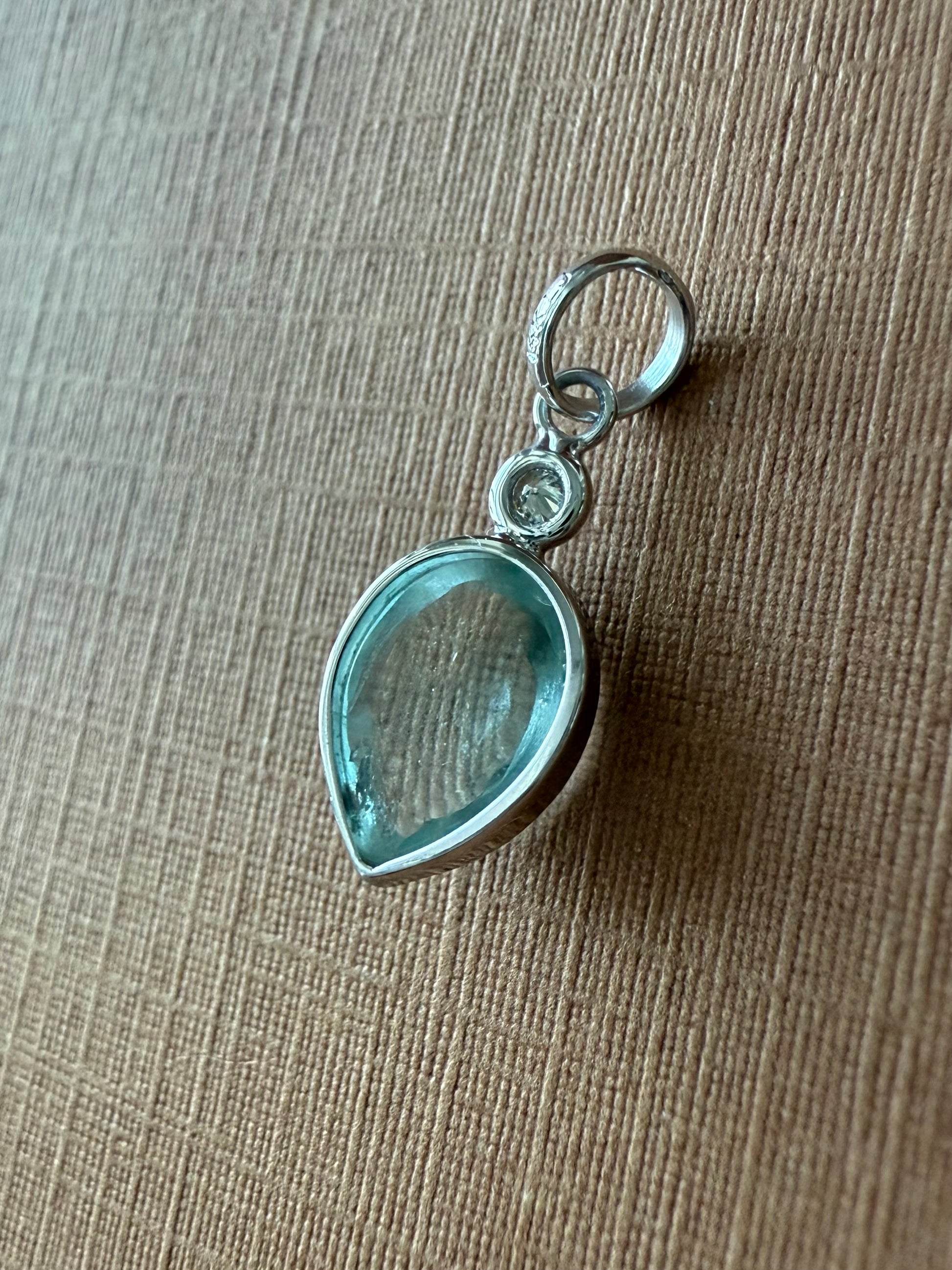 14k Solid White Gold, Diamond, Pale Blue Aquamarine Pear Cabochon Pendant, Mini Size