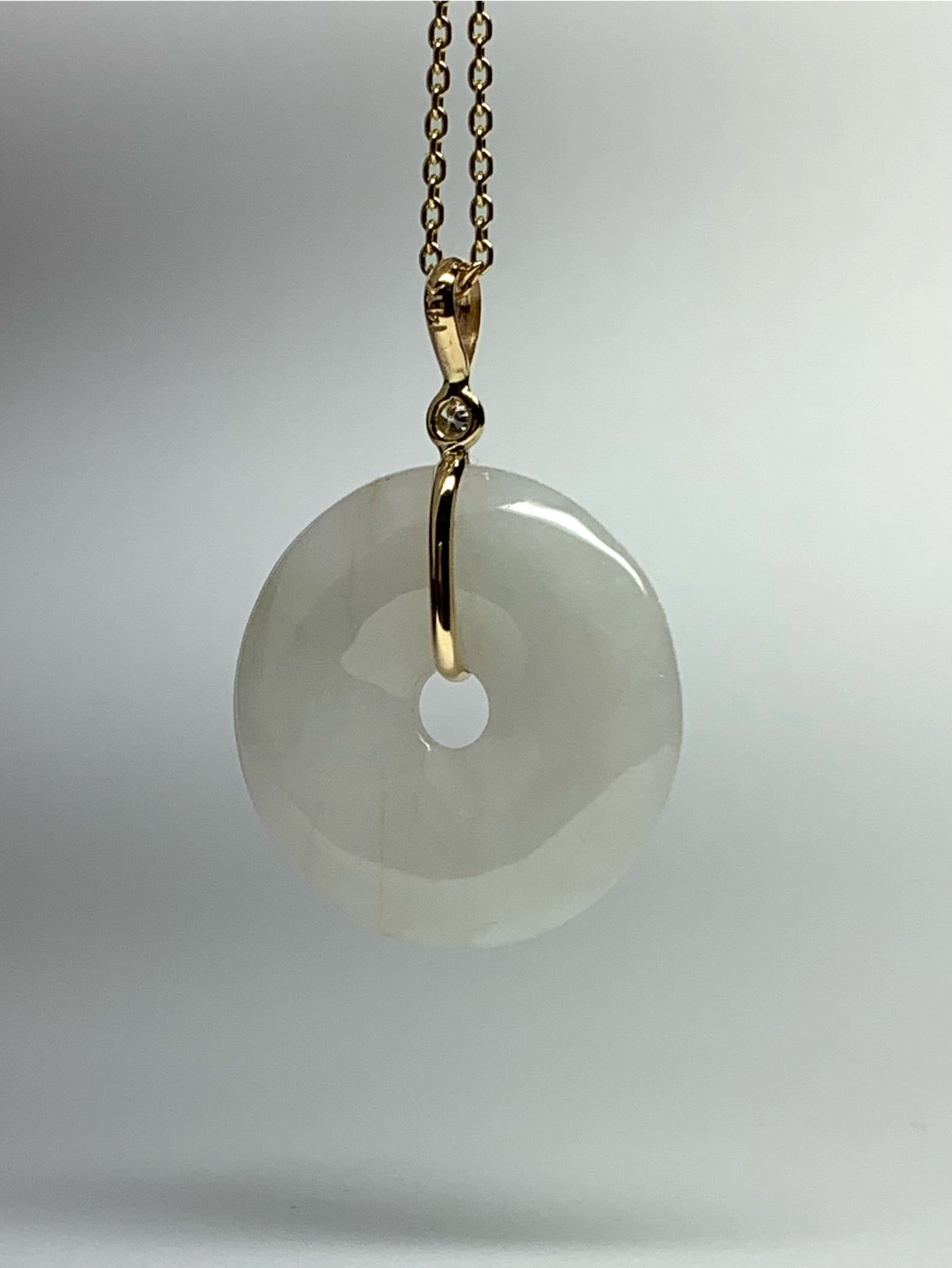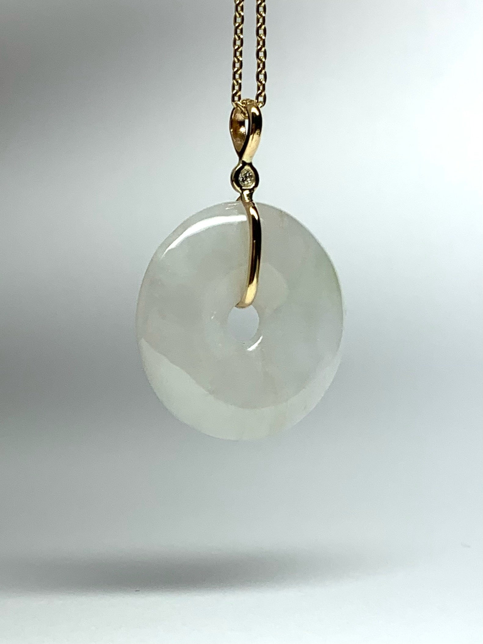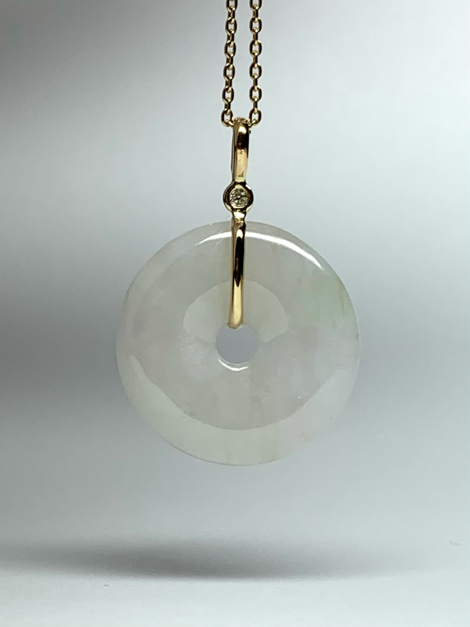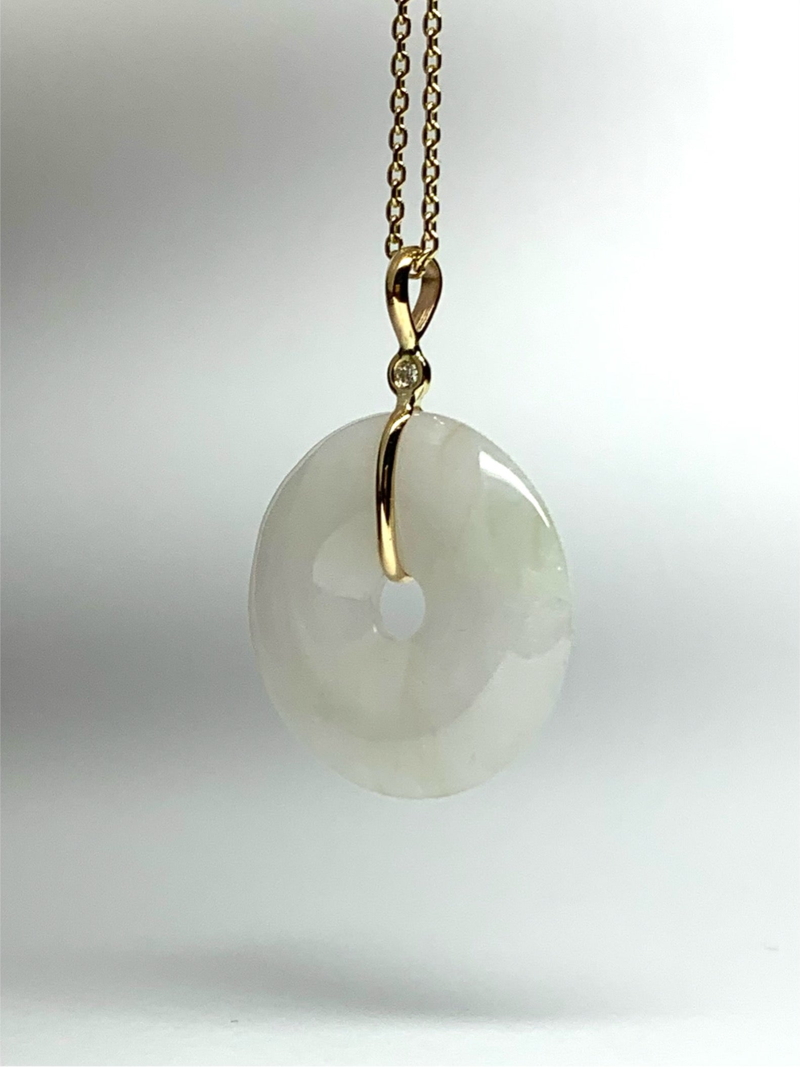 14k Solid Yellow Gold, Very Pale White Green Jade “Donut”, White Diamond Pendant