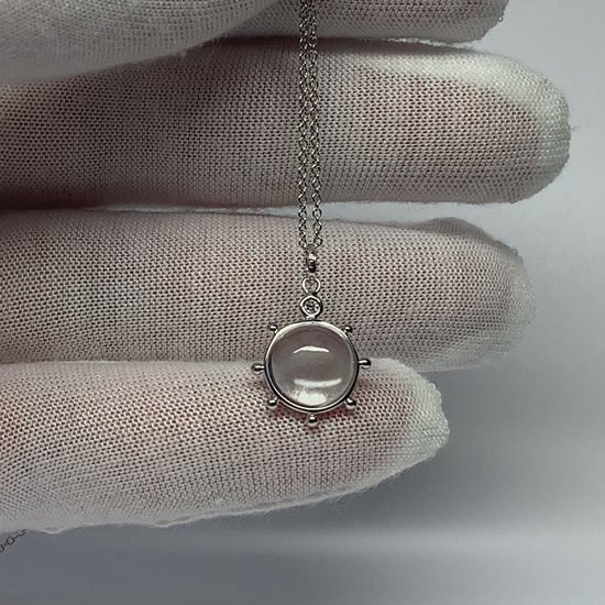 14K Solid White Gold, Natural Clear Quartz, Diamond “Sun” Pendant, Small Size
