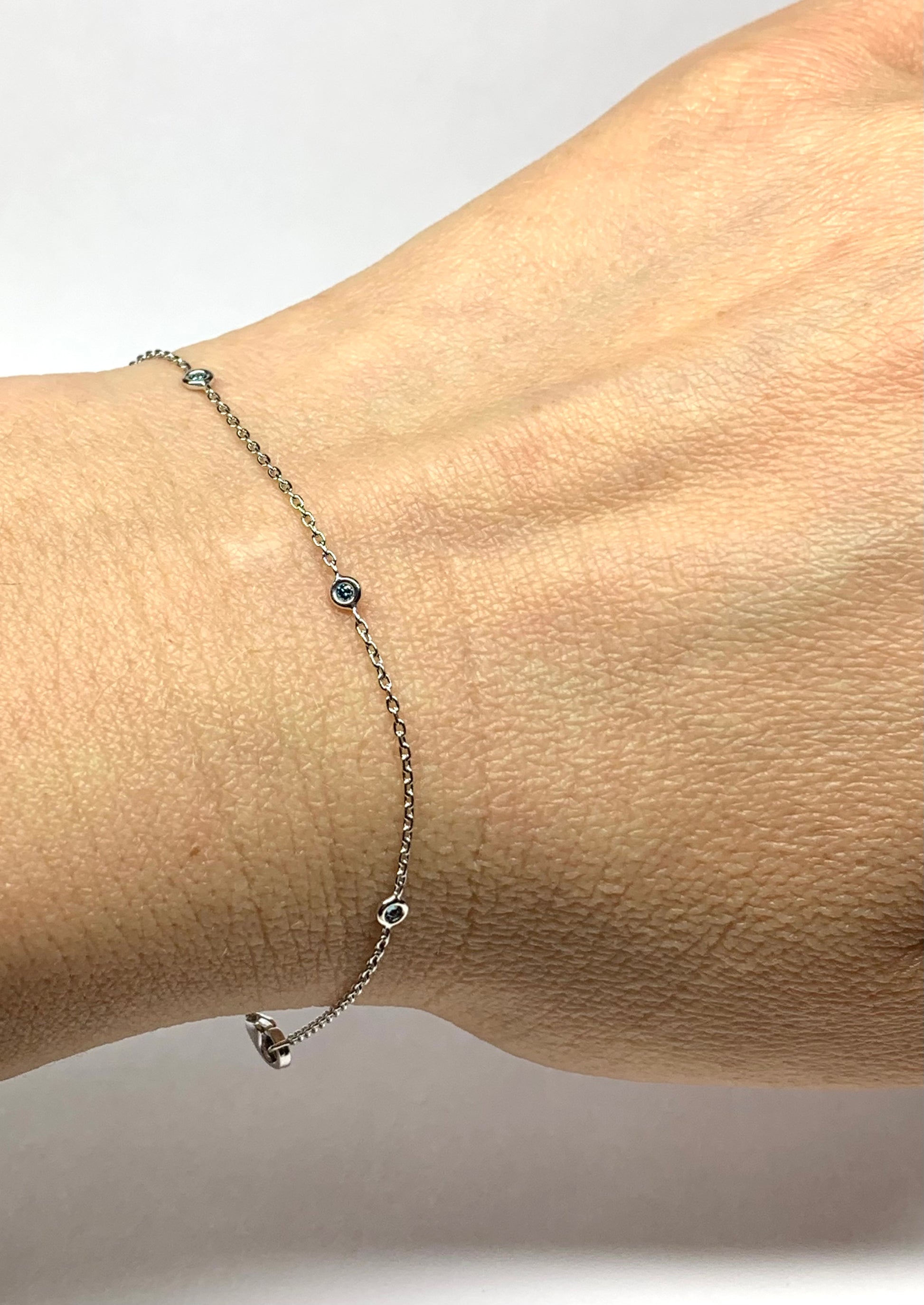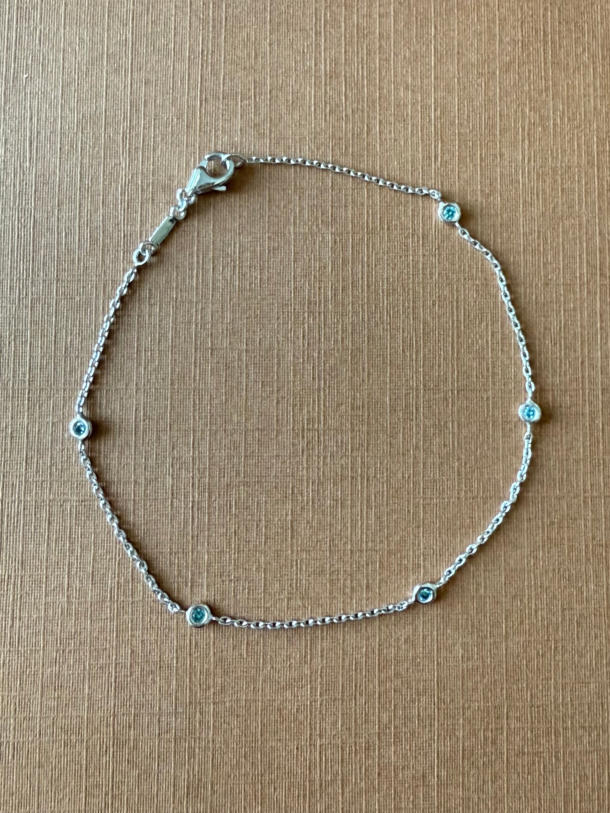Genuine blue diamonds, heated, 5 pieces, 0.02 carats each diamond, 0.1 carats total diamond weight per bracelet. Each diamond is 1.7mm round