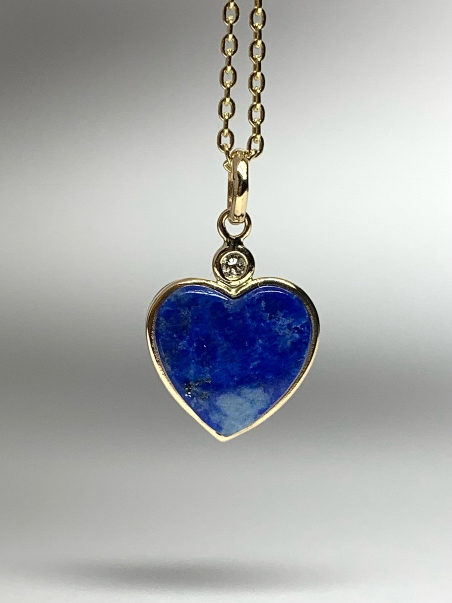 14k solid yellow gold, natural white diamond, natural blue lapis lazuli “Heart” pendant, mini size